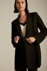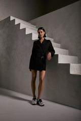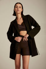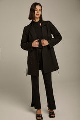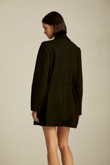 This versatile double breasted blazer done in a heavy weight stretch knit features a drawstring tie waist and can be worn as a blazer or dress.